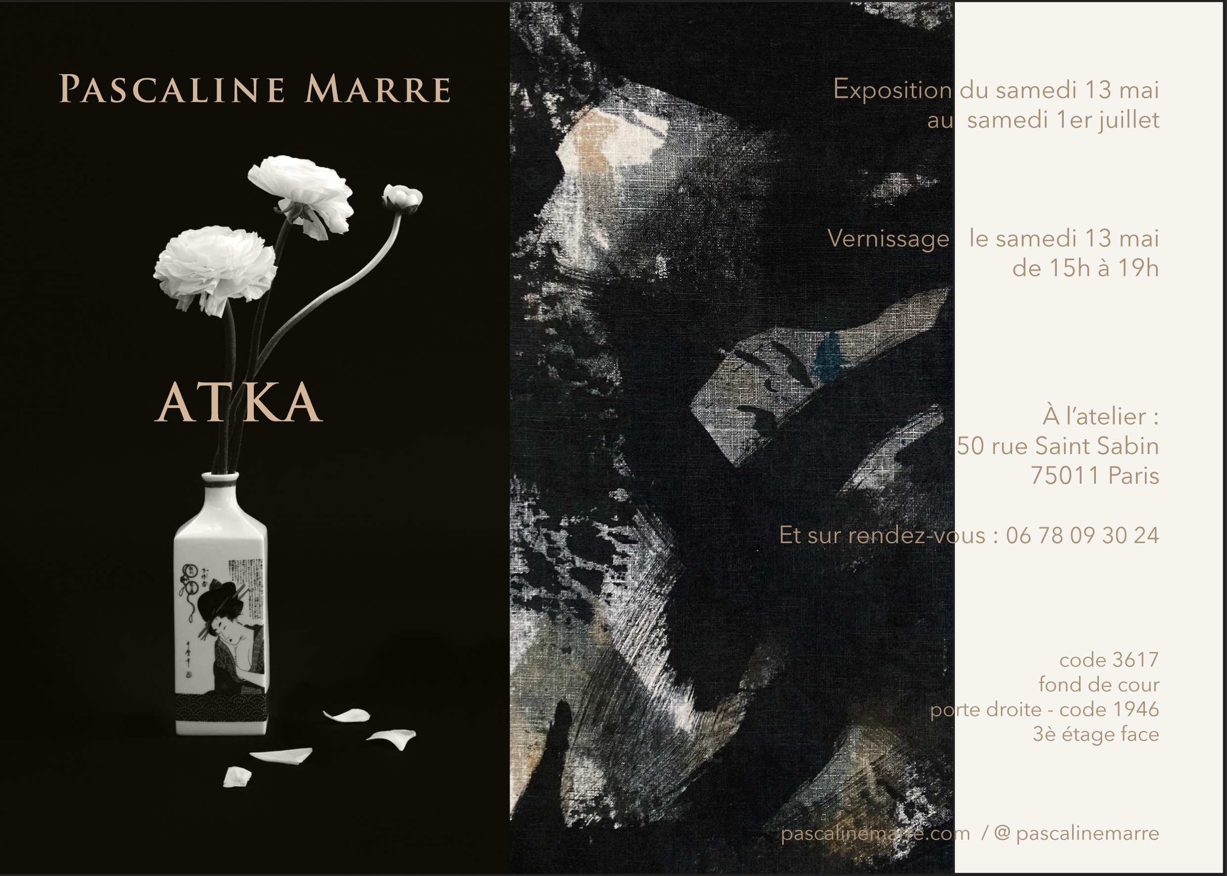 Je suis heureuse de vous inviter à une présentation d’ATKA à l’atelier du 13 mai au 1er juillet 2023, à travers une sélection de photographies, ainsi que des peintures inédites réalisées à l’encre. Au plaisir de vous y retrouver !